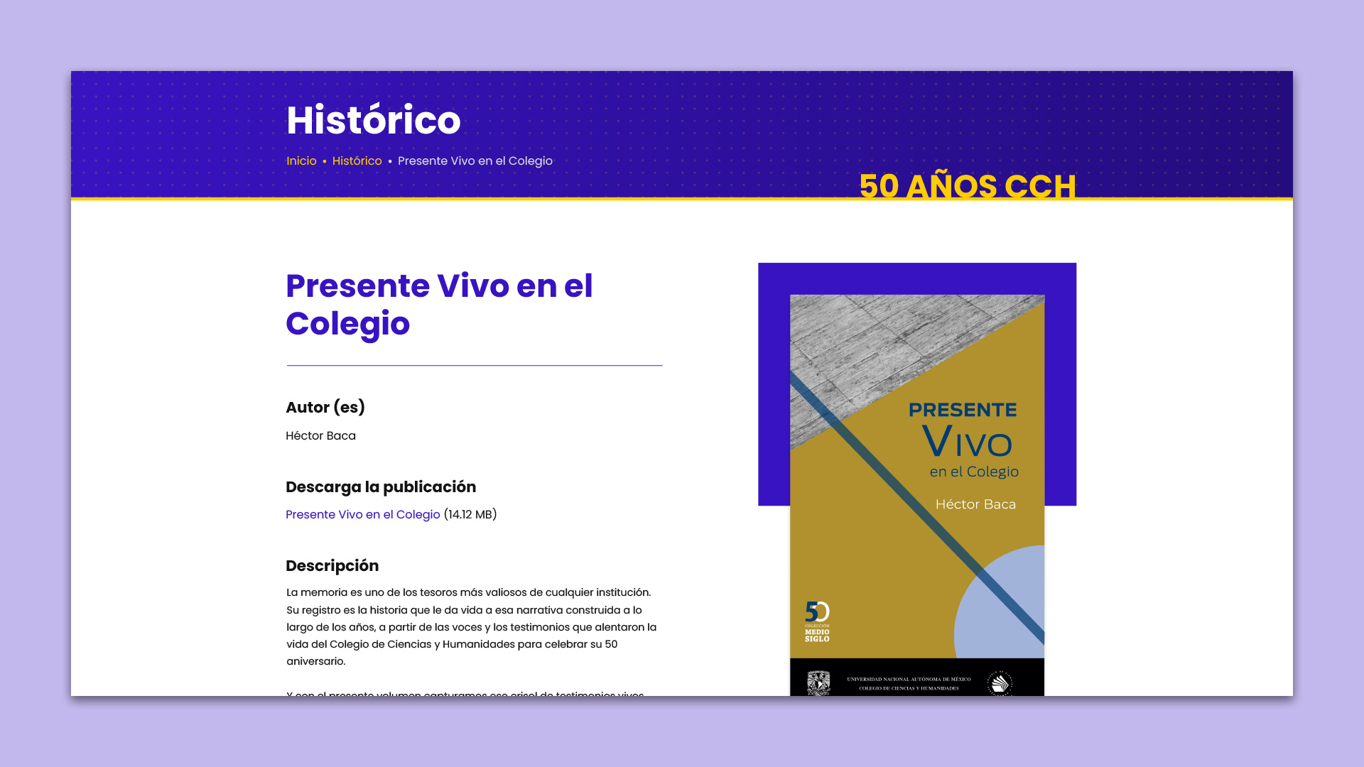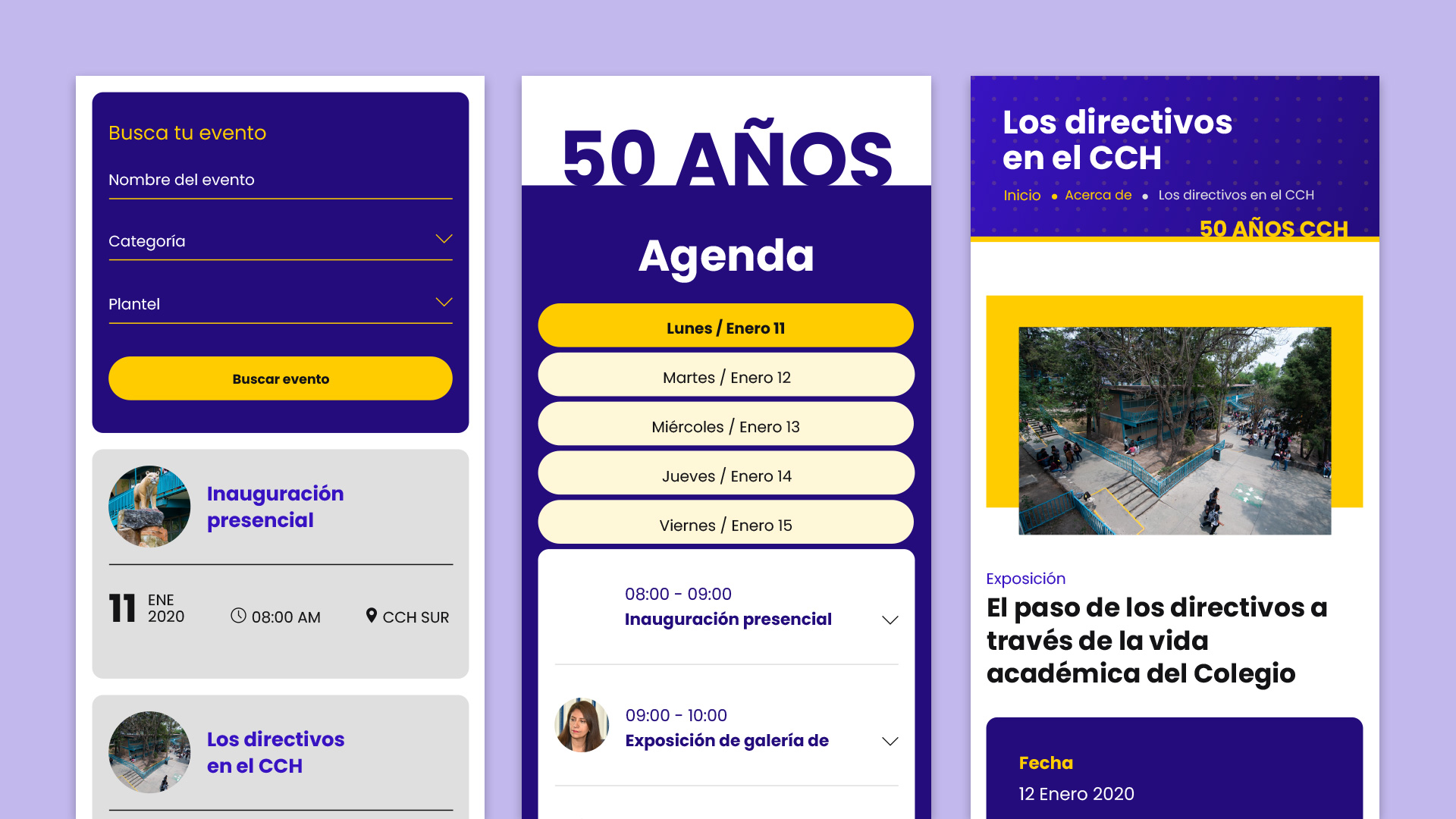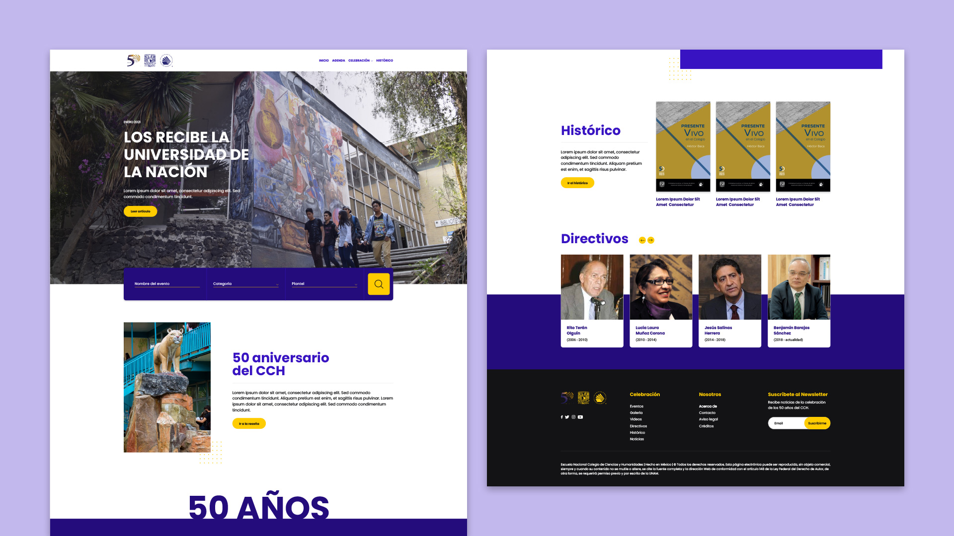 Desarrollé un sitio web dinámico y atractivo para celebrar el 50 aniversario del Colegio de Ciencias y Humanidades de la UNAM. La plataforma centraliza toda la información relevante sobre los eventos, recursos multimedia y publicaciones relacionadas con este hito histórico. A través de un diseño web intuitivo y una cuidadosa aplicación de principios de UI/UX, logré crear una experiencia de usuario favorable que facilita la navegación y el acceso a contenido valioso para la comunidad estudiantil, egresados y personal del colegio.